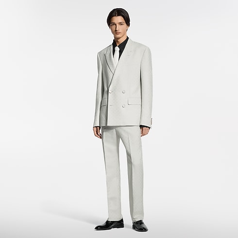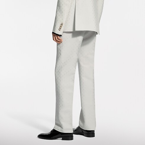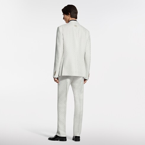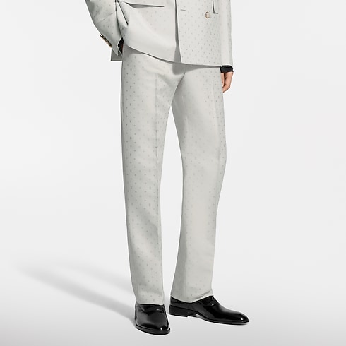 Diese elegante Hose für den Abend eignet sich perfekt für sommerliche Festlichkeiten und hebt sich durch ihren zarten Elfenbeinton ab. Das Modell aus einem exklusiven Seiden-Mohairgemisch ist mit einem Ton in Ton gehaltenen Spaced Mini Monogram-Motiv als Jacquardgewebe verziert, welches durch ein subtiles Spiel von matten und glänzenden Strukturen besticht. Ein passendes, zweireihiges Jackett komplettiert einen stilvollen Anzug.