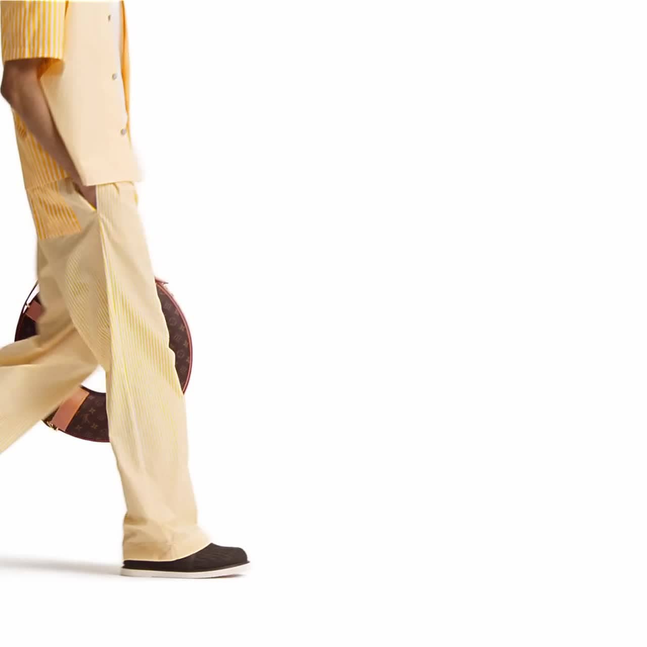 Diese sommerliche Hose mit Zugband ist aus leichter Baumwolle gefertigt und präsentiert ein mit leuchtend gelben Streifen bedrucktes Monogram-Jacquardgewebe. Für einen auffallenden Patchwork-Effekt sorgen die breiteren Steifen auf der Gesäßtasche, welche zudem ein dynamischer Aufnäher aus Gummi mit LV Flower-Motiv ziert. Zusammen mit dem passenden Hemd entsteht ein modischer, grafischer Look.