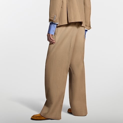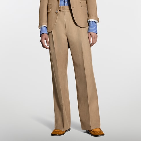 Diese kamelbraune Hose aus Wolle und Seide zeichnet sich durch eine elegante, fließend fallende Silhouette aus, die durch Falten auf der Vorderseite und den elastischen Taillenbund betont wird. Zu den kreativen Details zählt eine sportive Schließe, die von dem Bergsteiger-Thema dieser Kollektion inspiriert ist. Eine dezent aufgestickte Signatur ziert eine der Gesäßtaschen. Als perfekte Wahl, um die mühelos eleganten Looks dieser Saison abzurunden, bildet dieses Modell in Kombination mit dem passenden Jackett einen modischen Anzug.