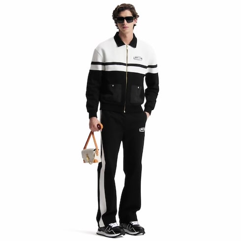 Dieser sportive schwarze Hybrid-Blouson aus Baumwolle mit Reißverschluss ist eine ausgezeichnete Wahl zum Reisen. Von seinem schwarzen Jersey heben sich Einsätze aus weißem Baumwoll-Piqué mit Waffelstruktur ab. Auf seiner Brust setzt indes eine gestickte L. Vuitton Signatur einen stilvollen Akzent. Mit der dazu passenden Hose kann dieses leichte, technische Modell zu einem eleganten Gesamtlook kombiniert werden.