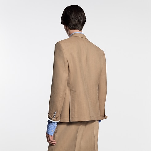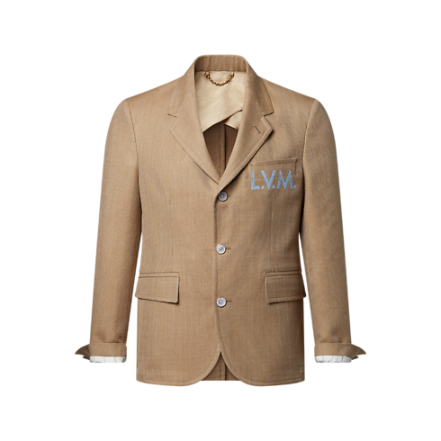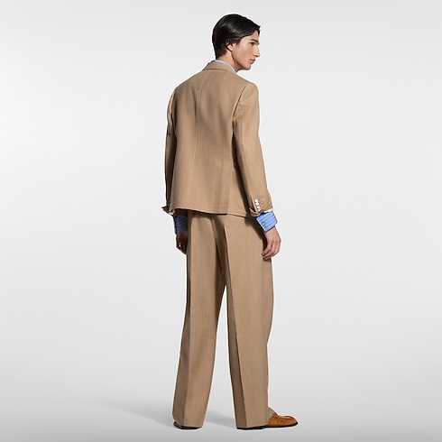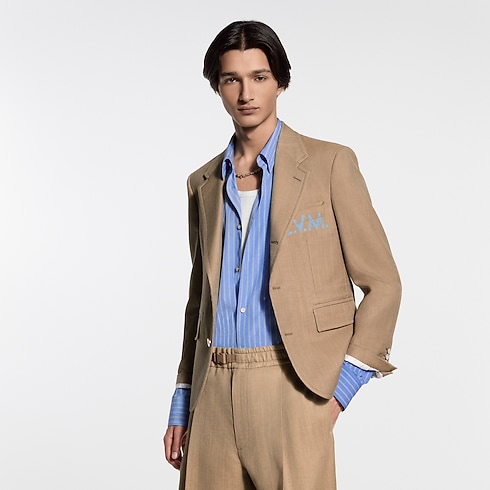 Dieses einreihige Jackett in einer kamelbraunen Nuance ist inspiriert vom indischen Dandy aus der Frühjahr Sommer 2026 Fashion Show. Es ist in einer etwas kürzeren Passform aus einem exklusiven Wolle-Seidengemisch gefertigt und wird durch eine auf die Brusttasche gedruckte L.V.M. Signatur akzentuiert. Die Manschetten lassen sich - wie auf dem Laufsteg - umschlagen, sodass ein elegantes, gestreiftes Innenfutter erscheint. Zusammen mit einer passenden Hose samt Zugband lässt sich das Modell zu einem modischen Anzug kombinieren.