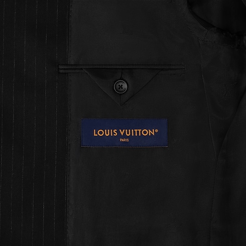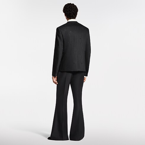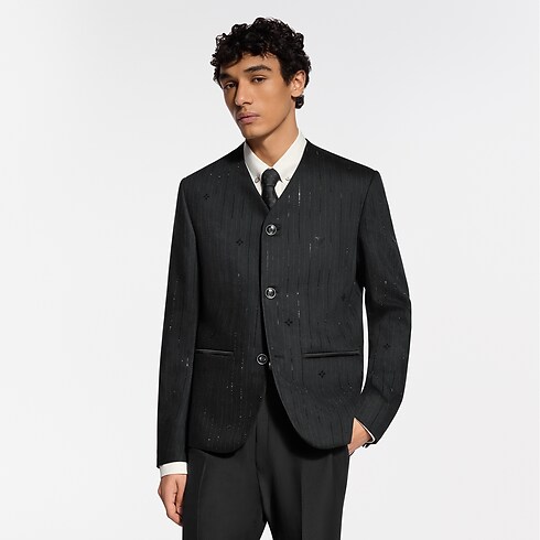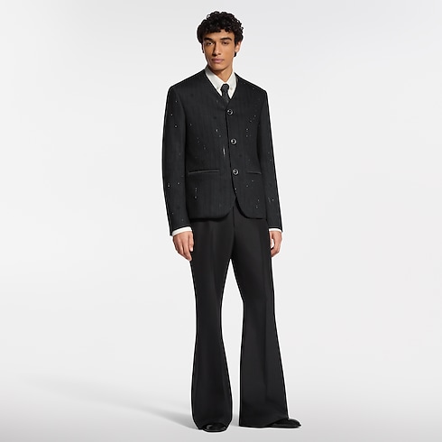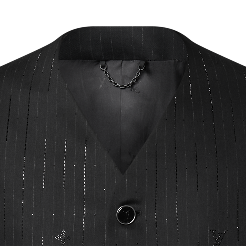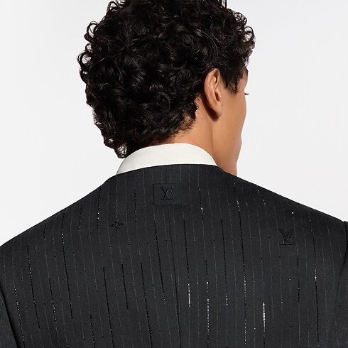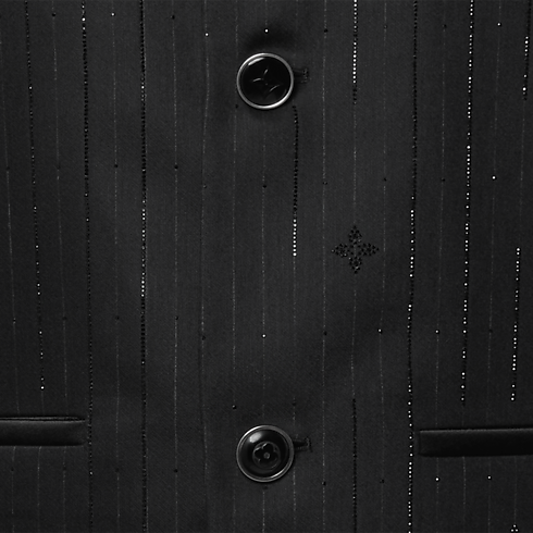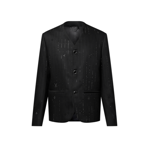 Dieses unverkennbare schwarze Jackett für den Abend greift den ikonischen, kragenlosen Stil von Pharrell Williams auf. Das schlichte Modell zeichnet sich durch einen V-Ausschnitt und Taschen mit Paspelierung aus Satin aus. In die Nadelstreifen ist funkelnder Kristall-Strass samt Monogram-Details eingebettet. LV Manschettenknöpfe und Knöpfe mit Signatur setzen juwelenartige Akzente. Das Modell mit aufwendigen Details verleiht jedem Look für den Abend eine raffinierte Note.