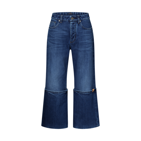 Ein Spiel mit Proportionen verleiht dieser unverzichtbaren Jeans eine ausdrucksstarke Note. Das Modell aus grobem Denim mit einem dezenten Farbverlauf wird akzentuiert durch sich farblich abhebende Ziernähte, die die Konstruktion hervorheben. Der angenehme, hohe Taillenbund und die gerade Form kreieren eine elegante Silhouette. Hervorgehobene, übergroße Umschläge, von denen einer mit einer dezenten LV Circle Schlaufe aus Leder versehen ist, setzen einen modischen Akzent.