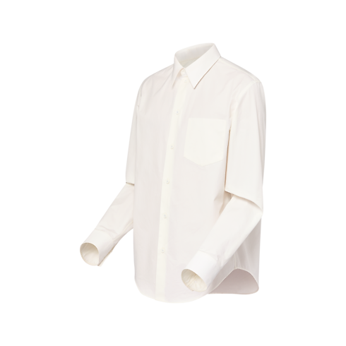 Dieses weiße, aus Baumwolle gefertigte Hemd in regulärer Passform ist ein unverzichtbares, zeitloses Kleidungsstück aus der Frühjahr Sommer 2024 Fashion Show, das die Looks im Maßkonfektions-Stil aus der Kollektion perfekt vervollständigt. Das Modell besitzt eine aufgesetzte Tasche auf der Brust. Seine Rückseite ziert ein Ton in Ton gehaltener Aufnäher mit in Schreibschrift aufgestickter „Marque L. Vuitton déposée“ Signatur.