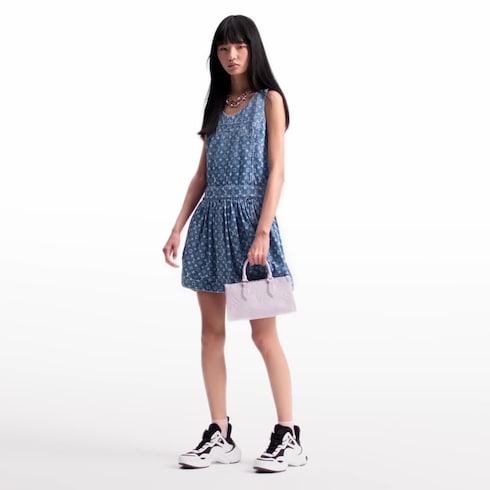 Dieses Kleid aus weichem, leichtem Denim mit durchgängigem Monogram-Motiv der aktuellen Saison ist ein stilvoller und ausdrucksstarker Begleiter für den Alltag. Die sich farblich abhebenden, gelben Absteppnähte verleihen dem Brustbereich Struktur, während die Raffungen am Taillenbund fließend in einen voluminösen Bubble-Rock übergehen. Auf der Rückseite setzt ein freiliegender Reißverschluss einen modischen, sportiven Akzent.