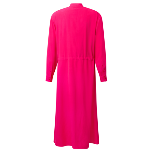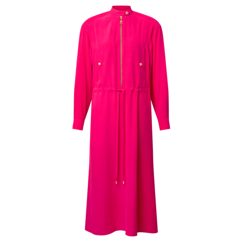 Dieses leuchtende, luftige Kleid aus Seiden-Krepp präsentiert sich in einer auffälligen saisonalen Nuance. Die langärmelige, bodenlange Silhouette erhält durch ein Zugband an der Taille eine elegante Note. Goldfarbene Druckknöpfe am Stehkragen, zwei Taschen an den Seiten und ein freiliegender Reißverschluss verleihen dem Modell einen subtil sportiven Spirit.