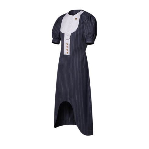 Dieses charakteristische Kleid der Nautical Kollektion aus Wolle mit Nadelstreifen verweist auf zeitlose Attribute der Maßkonfektion. Die figurbetonte, mittellange Silhouette wird durch voluminöse Ballonärmel und eine unverkennbare Aussparung am vorderen Saum akzentuiert, während die Brust mit einer sich farblich abhebenden Stoffbahn aus Baumwollpopeline mit mehrlagigen Knopfleisten versehen ist.