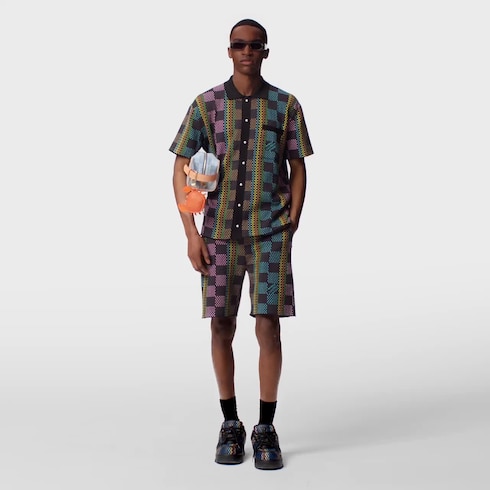 Dieses kurzärmlige Hemd interpretiert das ikonische Damier-Motiv in leuchtenden Farben neu. Die Jacquard-Technik ermöglicht die Kreation aufwendiger Details. Knöpfe mit perlenartigem Finish dienen als raffinierter Verschluss, während die „Marque L. Vuitton Déposée“ Signatur die Brusttasche akzentuiert. In Kombination mit den dazu passenden Shorts bildet dieser aus einem leichten Bio-Baumwollstrick gefertigte Entwurf ein stilsicheres sommerliches Ensemble.
