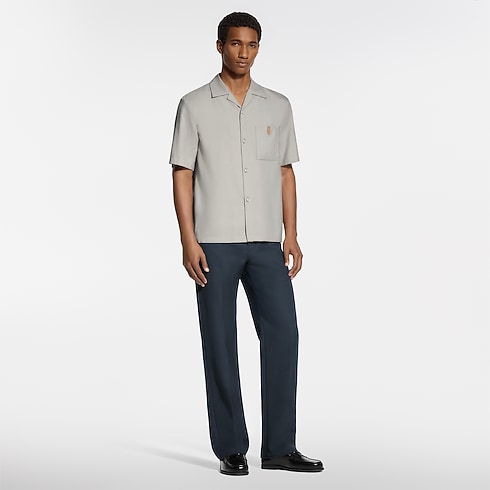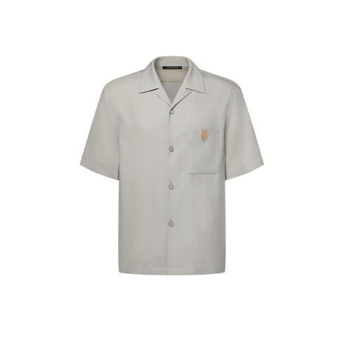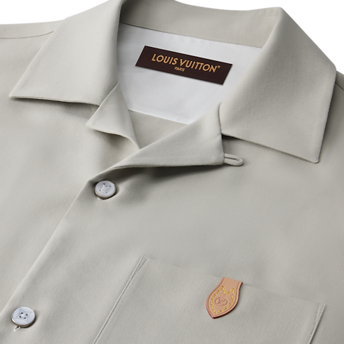 Dieses beigefarbene, kurzärmelige Hemd verbindet eine exklusive Note mit Tragekomfort. Leichter Twill aus einem Baumwoll-Seiden-Kaschmirgemisch sorgt für eine weiche Haptik und luftiges Flair. Das legere Modell in einer fließend fallenden Passform zeichnet sich durch einen offenen Kragen sowie eine LV Ziernaht am ersten Knopf aus. Die Brusttasche ist mit einer Schlaufe aus natürlich gegerbtem Rindsleder samt einer Signatur versehen, welche auf das Erbe des Hauses Louis Vuitton als Kofferhersteller verweist.