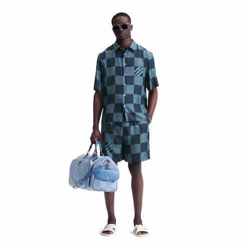 Dieses fließend fallende Kurzarm-Hemd aus exklusivem Seiden-Twill präsentiert sich mit einem durchgängigen grafischen Damier-Motiv samt Marque L. Vuitton Déposée Signaturen. Wird das Modell aus einem leicht glänzenden Stoff in eleganten Blautönen zu einfarbigen Kleidungsstücken kombiniert, entstehen mühelose, stilvolle Sommer-Ensembles. Währenddessen lässt sich in Kombination mit den dazu passenden Shorts ein raffiniertes Set für den Tag wie für den Abend zusammenstellen.