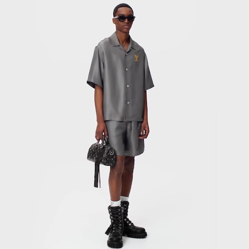 Ein legerer offener Kragen und fließend fallende, schimmernde Bio-Seide in einem edlen metallischen Grau verleihen diesem kurzärmeligen Hemd ein sommerliches Flair. Es präsentiert sich mit LV Ropes-Motiven aus der Herbst Winter 2024 Fashion Show, die an Lassos erinnern. Dazu zählen eine gedruckte LV Signatur auf der Brust sowie ein LV Lovers-Motiv auf der Rückseite. Knöpfe mit Perlmutt-Finish verleihen diesem Modell für den Tag wie für den Abend eine stilvolle Note. Mit den dazu passenden Shorts entsteht ein eleganter Sommerlook.