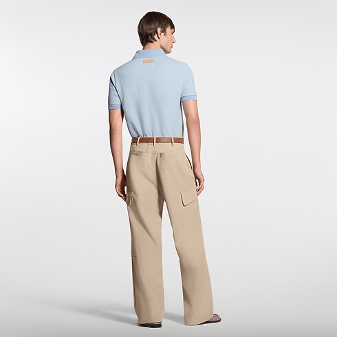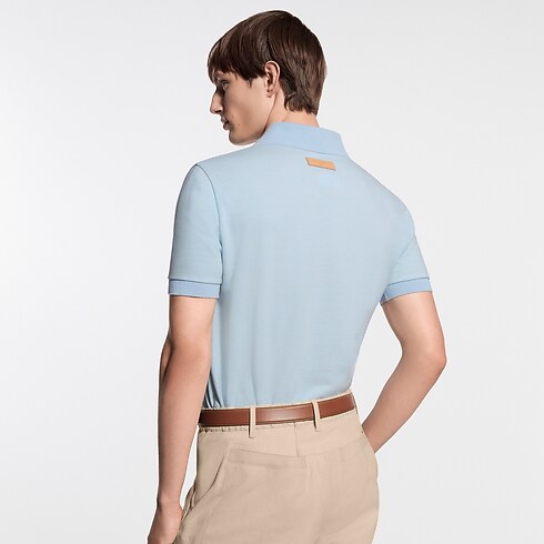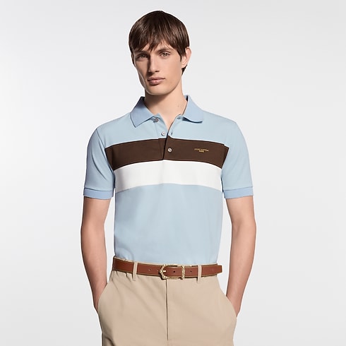 Dieses raffinierte Polohemd ist aus zartblauem Baumwollpiqué gefertigt und präsentiert sich mit kontrastierenden, waagerechten Bändern in Braun und Weiß über dem Oberkörper. Eine goldfarbene Louis Vuitton Paris Signatur als Hot Stamping verleiht der Brustpartie eine elegante Note, während ein Patch aus Leder mit Marque L. Vuitton Déposée Signatur den Rücken dieses Modells im Preppy-Stil ziert.