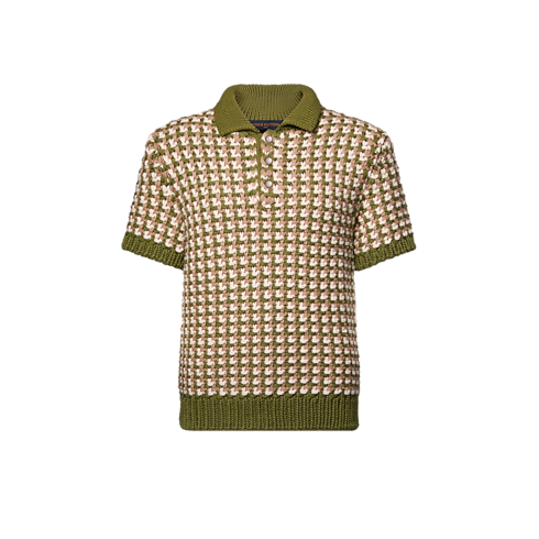 Dieses Modell vom Laufsteg der Frühjahr Sommer 2026 Fashion Show interpretiert das klassische Polohemd neu. Auf dem Grobstrick aus Wolle zeigt sich ein grafisches LV Stitch-Motiv in eleganten Grün- und Beigetönen. Ein charakteristischer Patch aus Leder mit einer Signatur rundet die Rückseite ab. Dieses Kleidungsstück lässt sich im Lagen-Look über einem Hemd tragen und sorgt so für ein raffiniertes Spiel von Farbe und Struktur.