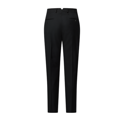 Dieser schwarze, klar definierte Anzug ist ein unverzichtbarer, zeitloser Entwurf für das Büro. Das Modell aus Ton in Ton gehaltenem Woll-Jacquardgewebe ist mit einem durchgängigen LV Blason-Motiv verziert, das sich auf dem Innenfutter fortsetzt. Eine elegante Zigarettenhose ergänzt das einreihige Pont Neuf Jackett. Für eine charakteristische Note sorgen zudem eine LV Stickerei an der rechten Hüfte der Hose sowie Aufnäher mit unverkennbaren Signaturen.