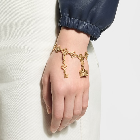 Das LV Charms Armband aus glänzendem, goldfarbenem Metall ermöglicht es jeder Trägerin, ihren ganz persönlichen Stil zu kreieren. Für sich genommen elegant, kann die Kette mit Monogram-Blüten auch dazu verwendet werden, Anhänger aus der ausgefallenen Accessoire Kollektion von Louis Vuitton zu befestigen. Das Ergebnis ist ein einzigartiges, besonderes Armband – eine originelle Möglichkeit, die ikonischen Signaturen des Hauses Louis Vuitton zu tragen.