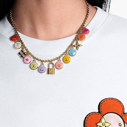Das auffällige, verspielte Design der LV Confetti Halskette ist eine Hommage an die geliebten Symbole des Hauses Louis Vuitton in Regenbogenfarben. An einer zarten goldfarbenen Kette hängen bunte Scheiben mit den ikonischen Monogram-Motiven, die von Monogram-Blüten und einem LV Hängeschloss durchsetzt sind. Diese elegante, auffällige Halskette verleiht jedem Look einen leuchtenden Farbakzent.