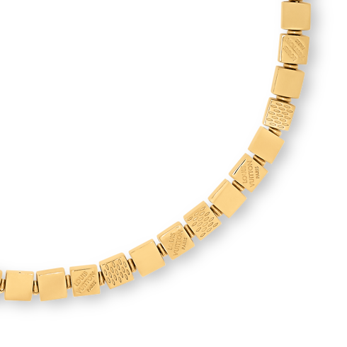 Die verspielt-elegante LV Cube Halskette wurde von zwei Ikonen aus der Geschichte des Hauses Louis Vuitton inspiriert: dem klassischen Damier-Motiv und Pateki, einem von Gaston Vuitton im Jahr 1932 erfundenen Puzzle-Spiel. Zart verbundene, goldfarbene Würfel aus Metall sind fein mit streifenförmigen Gravuren im Stil des Damier-Motivs sowie der Louis Vuitton Paris Signatur veredelt. Eine anspruchsvolle, auffällige Halskette - perfekt für den Alltag oder besondere Anlässe.