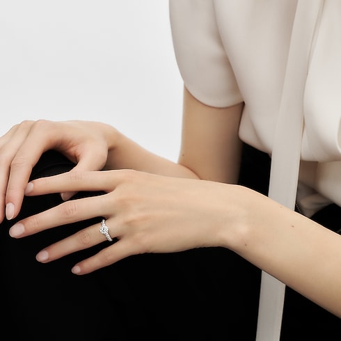 Das Herzstück dieses eindrucksvollen Rings aus der LV Diamonds Kollektion bildet ein Diamant im runden Brillantschliff auf einem Körbchen, welches an die Monogram-Blüte des Hauses Louis Vuitton erinnert. Der aus Platin gearbeitete Ring besitzt ein V-förmiges Profil und ist mit einem funkelnden Diamanten-Pavé besetzt. Unter dem Stein in der Mitte setzt eine zarte, ebenfalls in Form der Monogram-Blüte gestaltete Öffnung einen weiteren subtilen Akzent. Das Schmuckstück wird mit einem LV Diamantenzertifikat geliefert. Es handelt sich hierbei um ein einzigartiges und unveränderbares digitales Dokument mit Informationen zu den Charakteristika des Diamanten im Mittelpunkt des Designs sowie zu seinem Weg von der Schürfung bis zur Einfügung in das Schmuckstück. Dieses sichere Zertifikat basiert auf der Technologie des Aura Blockchain Consortiums. Das Modell lässt sich durch eine individuelle Gravur zu einem wahrlich einzigartigen Erinnerungsstück personalisieren.