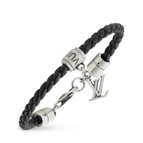 Das in Spanien gefertigte LV Dimension Armband kombiniert zeitlose Elemente mit besonders exklusiver Handwerkskunst. Der Entwurf umfasst einen Riemen aus geflochtenem schwarzem Leder, einen palladiumfarbenen Hakenverschluss und einen subtilen, gravierten Anhänger, die zusammen einen mühelos modischen Look schaffen. Ein unverzichtbares Modell für den Alltag.