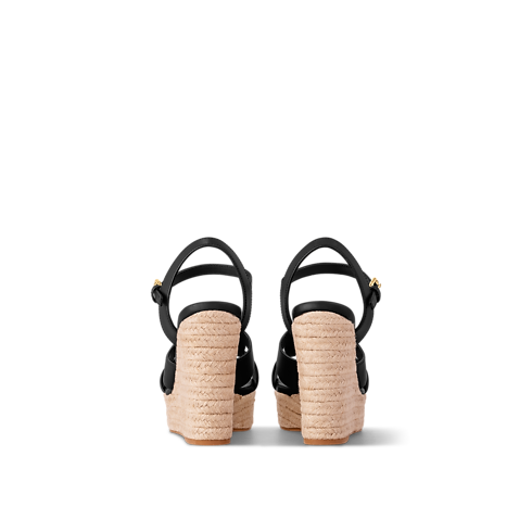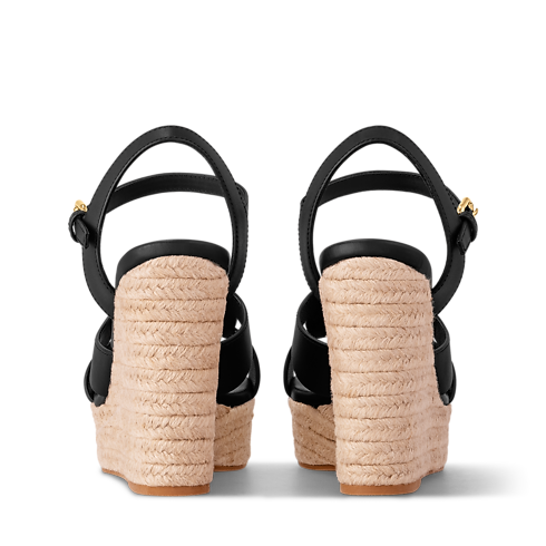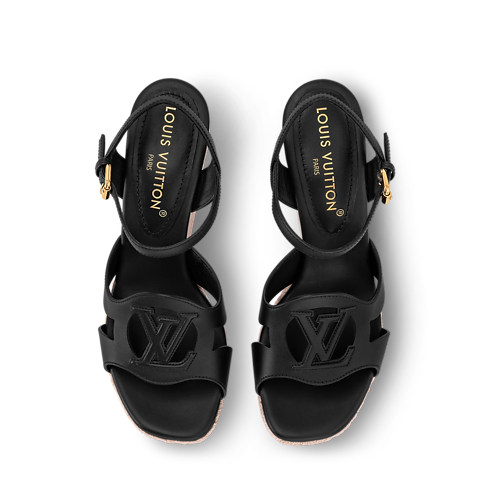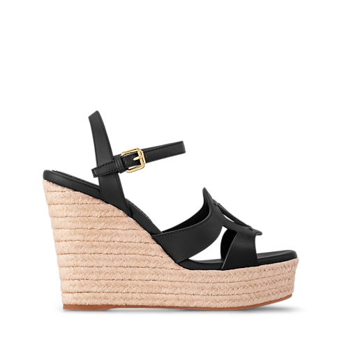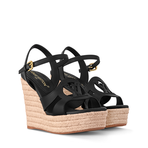 Die LV Isola Sandale mit Keilabsatz vereint einen Schaft aus geschmeidigem Kalbsleder mit einer bequemen, geflochtenen Bastsohle, die an die klassische Espadrille erinnert. Das unverkennbare LV Circle-Motiv, das aus dem Schaft ausgeschnitten ist, ist charakteristisch für die LV Isola Linie. Dieses zugleich entspannte und elegante Modell wird mit einer goldfarbenen Schließe am Knöchel geschlossen.