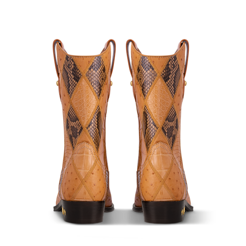Der ikonische LV Rider Stiefel, der erstmals bei der Herren Frühjahr Sommer 2024 Fashion Show von Pharrell Williams zu sehen war, ist nun als außergewöhnliche Sonderanfertigung erhältlich. Exklusives Straußen-, Python- und Alligatorleder sind hierbei in rautenförmiger Optik miteinander vernäht, um ein Spiel der verschiedenen Strukturen zu kreieren. Zu den weiteren bedeutenden Details des Modells zählen eine geprägte Vuitton Signatur an den Anziehriemen und goldfarbene Monogram-Blüten an dem Absatz.