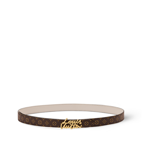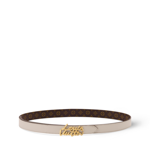 Der wendbare LV Script Gürtel bietet die Wahl zwischen hochwertigem Kalbsleder und dem ikonischen Monogram Canvas des Hauses Louis Vuitton. Im Mittelpunkt steht eine übergroße Schließe aus glänzendem, goldfarbenem Metall mit der Louis Vuitton Signatur in feiner Handschrift. Dieser vielseitige Gürtel ist ideal für sowohl legere als auch formelle Anlässe und strahlt Raffinesse sowie zeitlose Eleganz aus.