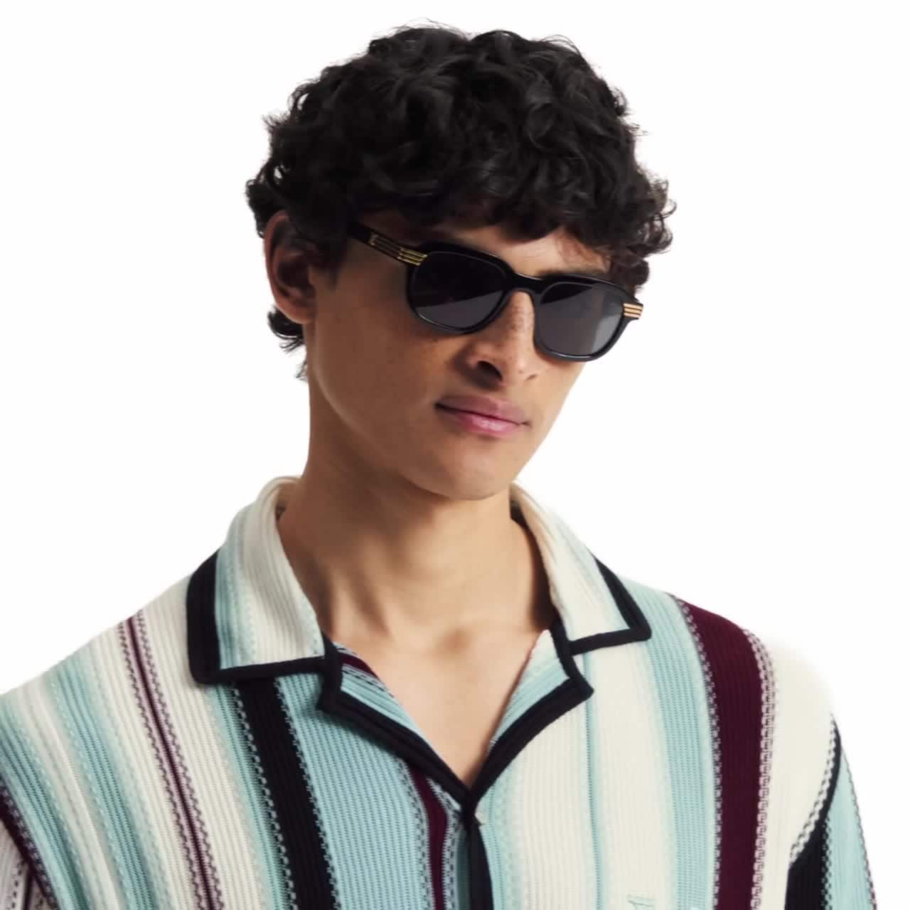 Die LV Slide Square Round Sonnenbrille zeigt sich ebenso abgerundet wie eckig. Das Design vereint Handwerkskunst mit edlen Details. Der Rahmen aus glänzendem Azetat ist mit vier goldfarbenen Streifen aus Metall verziert, welche sich von den Brauen bis auf die Hälfte der Bügel erstrecken und in einer LV Signatur enden. Dieses Accessoire entfaltet eine mysteriöse, bedeutungsvolle Wirkung.