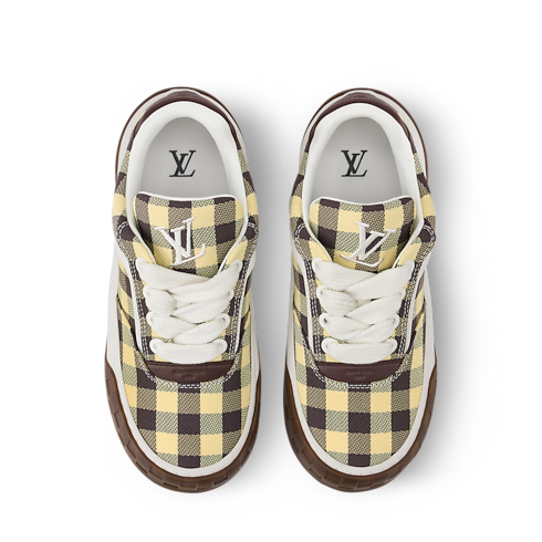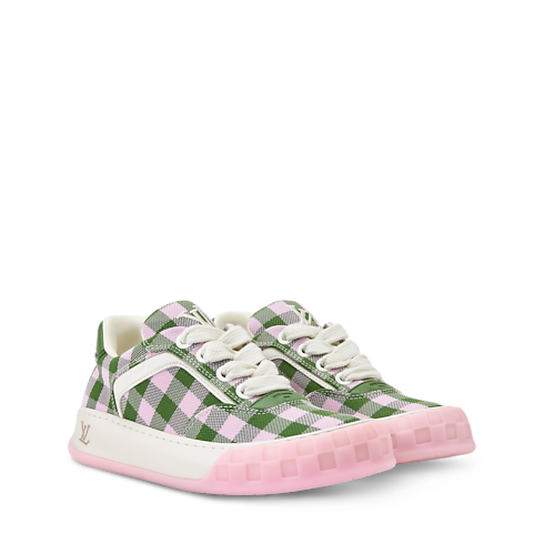 Der LV Tilted Sneaker präsentiert sich in einer Kombination von Materialien mit einem farbenfrohen Gingham-Motiv, einem Hauptthema der Saison. Das Modell ist von Vintage-Sneakern und Skaterschuhen inspiriert und verdankt seinen Namen den schräg platzierten LV Initialen auf der Zunge und der Außensohle - als Verweis auf die Bewegung beim Skateboarden. Ein weiteres charakteristisches Detail ist das Damier-Motiv auf der zweifarbigen Außensohle.