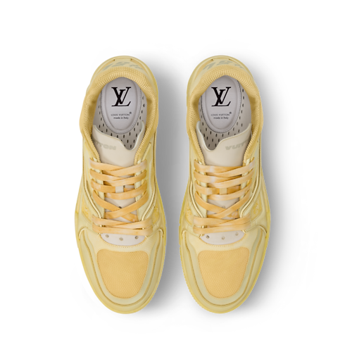 Diese Version des ikonischen LV Trainer Sneakers wurde speziell für das Segeln interpretiert und verfügt über einen wasserabweisenden Schaft aus einer raffinierten Kombination technischer Materialien sowie eine Außensohle aus Gummi, die eigens für optimalen Halt entwickelt wurde. Der Schaft zeigt sich mit einem dezenten Farbverlauf, der durch das Eintauchen in eine Farblösung erzielt und von den verschiedenen Materialien unterschiedlich aufgenommen wird.