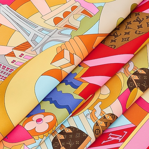 Im kunstvollen Motiv des LV Wonderland Carrés trifft Innovation auf Fantasie. Der Druck auf hochwertiger Seide zeigt eine verspielte, futuristische Landschaft mit erblühenden Monogram-Blüten, kombiniert mit ikonischen Koffern und Taschen des Hauses Louis Vuitton sowie einer Signatur der Maison in dynamischer 3D-Optik. Mit seinen leuchtenden Farben und auffälligen Kontrasten sorgt dieses vielseitige Accessoire für einen ebenso eleganten wie kreativen Auftritt.