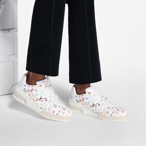 Der LV Trainer Sneaker wird in Monogram Multicolore Canvas neu interpretiert, dem leuchtenden Motiv, das der Künstler Takashi Murakami für das Haus Louis Vuitton geschaffen hat. Eine Paspelierung im ikonischen Naturleder unterstreicht die Konstruktion dieses Designs, das an Vintage-Basketball-Sneaker erinnert. Zu den besonderen Details zählen der geschwungene Louis Vuitton Schriftzug und die Nummer #54, ein Verweis auf das Jahr 1854, in dem die Maison gegründet wurde.