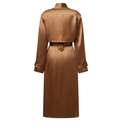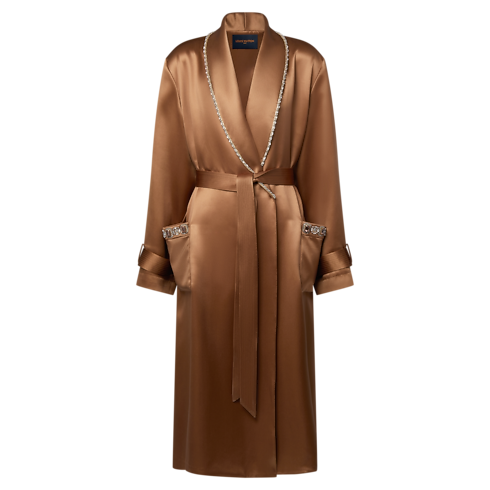 Dieser Mantel aus satinierter Doubleface-Seide mit glänzendem Metallic-Finish vereint legere und raffinierte Attribute. Das Modell, welches vom entspannten Stil eines Morgenmantels inspiriert ist, präsentiert sich mit einer fließenden, bodenlangen Silhouette samt langem Gürtel zum Binden. Der Schalkragen und die aufgesetzten Taschen werden durch schimmernde, juwelenartige Verzierungen betont, während Manschetten mit Riemen für eine strukturierte Note sorgen.