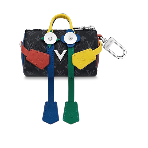 Hier präsentiert sich der Mister Keepall Taschenschmuck und Schlüsselanhänger: eine neue Symbolfigur, die das Erbe in der Lederhandwerkskunst des Hauses Louis Vuitton auf höchst verspielte Weise widerspiegelt. Es ist in Monogram Eclipse Canvas gefertigt und mit Details auf farbenfrohem Leder verziert. Elemente aus Metall mit Palladium-Finish und feine Gravuren runden das Design ab. Dieser attraktive Anhänger schmückt Handtaschen und sichert wertvolle Schlüssel ganz im Stil des Hauses Louis Vuitton.