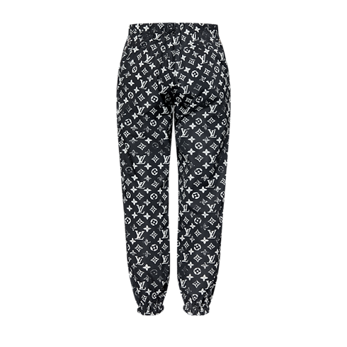 Dieses legere Modell vereint einen sportiven Akzent mit einer grafischen Louis Vuitton Signatur. Es ist aus einem technischen Gewebe gefertigt und trägt das ikonische Monogram-Motiv des Hauses Louis Vuitton, welches dank des unverkennbaren Schabloneneffekts neu interpretiert wird. Die Details umfassen einen Hakenverschluss, elastische Bündchen an den Beinen, einen elastischen Taillenbund sowie zwei Reißverschlusstaschen an den Seiten.