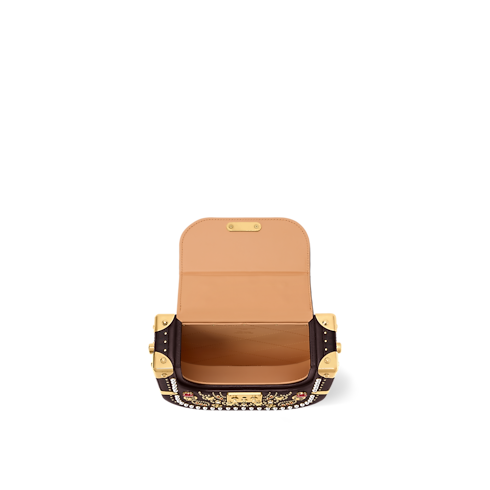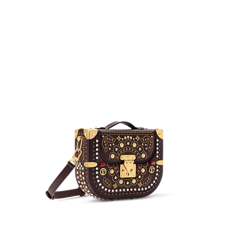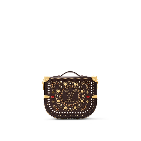 Ein exquisites Meisterwerk: Der Montsouris Koffer besticht durch seine abgerundete Silhouette, veredelt mit Steinen aus Kunstharz, Perlen und Louis Vuitton Nieten - eine Hommage an die Kunstfertigkeit indischen Schmucks. Das aufwendige Muster umfasst etwa 1.500 Nieten und Steine. Inspiriert von der Messenger Tasche für Herren, bietet er einen Überschlagverschluss, ein geräumiges Innenfach, einen oberen Griff sowie einen abnehmbaren Schulterriemen.