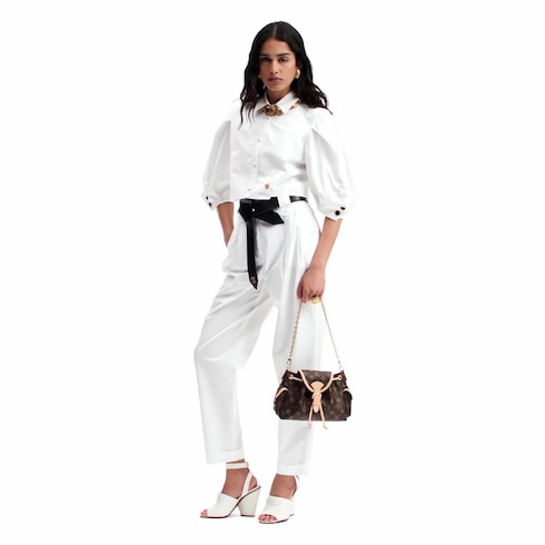 Wir präsentieren: Die Odyssée Handtasche aus der Pre-Fall 2025 Kollektion, die als Hommage an das Erbe des Hauses Louis Vuitton konzipiert wurde. Dieses elegante Modell für jeden Tag ist in unverkennbarem Monogram Canvas gefertigt und mit goldfarbenen Schließen sowie einer abnehmbaren, dekorativen Kette verziert. In den seitlichen Taschen findet alles Wesentliche wie Schlüssel oder Lippenstift mühelos Platz.