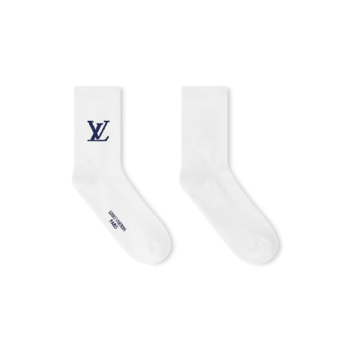 Die in Italien gefertigten Only LV Socken verleihen einem sportiven Klassiker eine schlichte Eleganz. Die LV Initialen in tiefem Blau sind auf das weiße Baumwollmischgewebe oberhalb des Knöchels eingestrickt. Der Schriftzug LOUIS VUITTON PARIS auf der Unterseite des Fußes ist ein überraschendes Detail für den Träger.