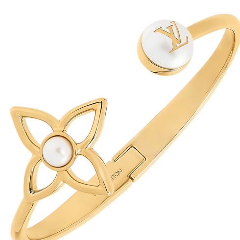 Die ikonische Monogram-Signatur wird mit der Symbolik der Perle im subtil glamourösen Design des Pearly Flower Armbands kombiniert. Gefertigt aus goldfarbenem Metall, präsentiert es eine Aussparung in Form einer Monogram-Blüte sowie zwei Perlen aus Kunstharz, von denen eine mit den LV Initialen versehen ist, was ihr zusätzliches, charakteristisches Flair verleiht. Perfekt für jeden Anlass, strahlt dieses exquisite Armband feminine Raffinesse aus.