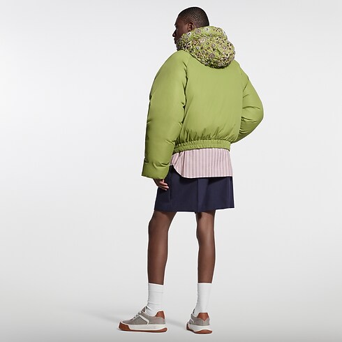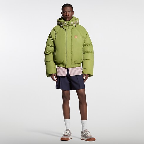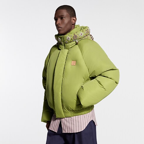 Diese leuchtend grüne Daunenjacke vom Laufsteg ist auf Bestellung erhältlich und von dem eleganten Bergsteiger-Thema der Frühjahr Sommer 2026 Fashion Show inspiriert. Das entspannte, umhüllende Modell ziert eine mit Juwelen besetzte Kapuze, die von dem Erbe des indischen Kunsthandwerks inspiriert und mit Tausenden detailgenau von Hand aufgestickten Kristallen und Perlen versehen ist. Ein charakteristischer Patch aus natürlich gegerbtem Rindsleder auf der Brust rundet dieses außergewöhnliche Design ab.