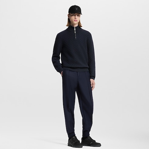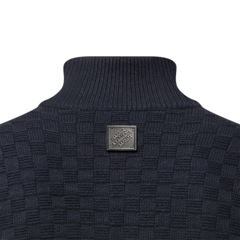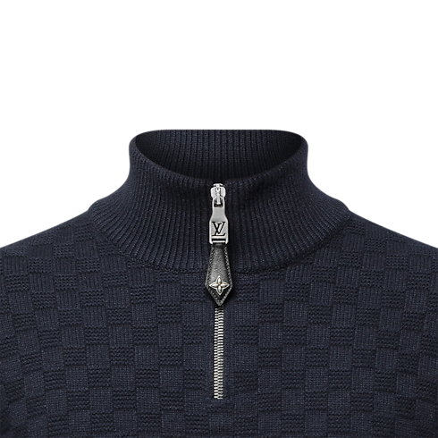 Dieser navyblaue Pullover aus einem feinen Kaschmir-Wollgemisch mit kurzem Reißverschluss verleiht formellen Looks eine legere Note. Ein durchgängiges, Ton in Ton gehaltenes Damier-Motiv ziert den strukturierten Strick des Modells, während die Rückseite eine Marque L. Vuitton Déposée Signatur aus Leder zeigt. Abschließend setzt ein Reißverschlussschieber aus Leder samt Monogram-Blüte einen unverkennbaren Akzent.