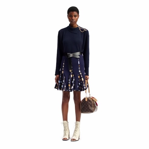 Dieser Strickrock setzt ein verspieltes Statement im Stil der Saison. Das in klaren Linien geschnittene Modell aus einem gerippten Baumwollgemisch umschmeichelt die Figur und greift einen raffinierten, saisontypischen Farbton auf. Währenddessen sorgen die Einsätze aus Satin mithilfe des auffallenden Halsketten-Motivs der Kollektion für dynamisches Volumen und Farbe. Dabei kombiniert das Design Louis Vuitton Signaturen in Form von Anhängern mit intensiv gefärbten Edelsteinen.
