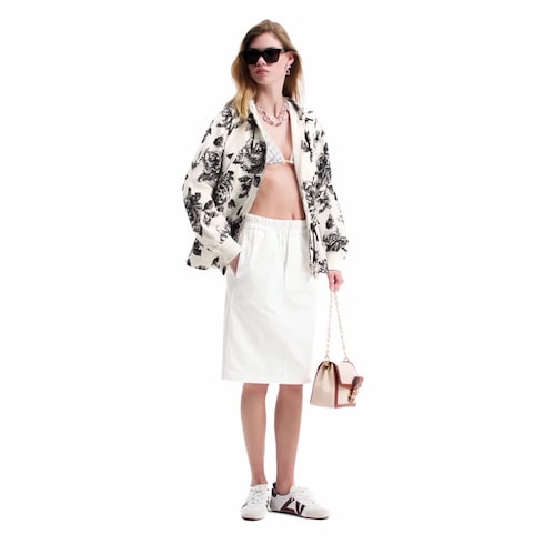 Dieser verspielte Rock ist von Attributen der Herrenmode inspiriert, darunter ein elastischer Taillenbund mit zwei kleinen Knöpfen und einer Ziernaht im Stil eines Hosenschlitzes. Das Modell aus legerem Baumwolljersey ist in einer schlichten, knielangen Silhouette geschnitten und eignet sich somit perfekt für Ensembles für den Alltag. Gleichzeitig greift die Ton in Ton gehaltene Tasche in geprägtem Monogram Denim zusammen mit dem goldfarbenen Louis Vuitton Beschlag auf der Rückseite eine charakteristische Note auf.