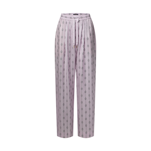 Die unverkennbare Schlafanzughose des Hauses Louis Vuitton aus fließender Seide in einer romantischen Nuance der Saison vereint Komfort und Anmut. Das Modell in einer luftigen, oversized geschnittenen Passform wird durch ein Zugband an der Taille betont. Eine aufgesetzte Tasche mit Knopf auf der Rückseite rundet den zeitlosen Loungewear-Look ab. Das durchgängige Streifen-Motiv ist mit eleganten juwelenartigen Details versehen.