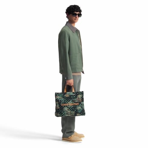 Diese Shopper Tote aus Baumwolljacquard präsentiert sich mit einem Miami-Postkartenmotiv im Vintage-Stil. Das Design mit klassischen Symbolen der Metropole vor einem meerblauen Hintergrund, darunter Palmen, ikonische Bauwerke und ein Oldtimer, fängt ihr pulsierendes Nachtleben auf eindrucksvolle Weise ein. Beinahe in den aufwendigen Darstellungen verborgen ist die von Pharrell Williams wiederentdeckte „Marque Déposée L. Vuitton“ Signatur.