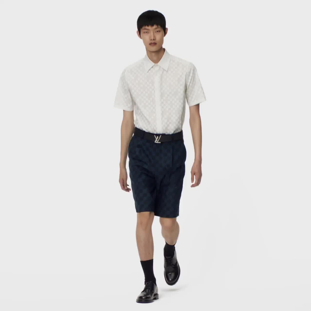 Diese eleganten Shorts mit Falten an der Vorderseite eignen sich perfekt für wärmere Tage. Das leichte Jacquardgewebe aus Wolle mit Stretch zeigt ein grafisches, wellenförmiges Damier-Motiv mit dezenten LV Signaturen in Blau- und Schwarztönen — eine modische Neuinterpretation der ikonischen Signatur des Hauses Louis Vuitton. In Kombination mit einem passenden Napolitana Jackett lässt sich das Modell zu einem zeitgemäßen, sommerlichen Anzug kombinieren.
