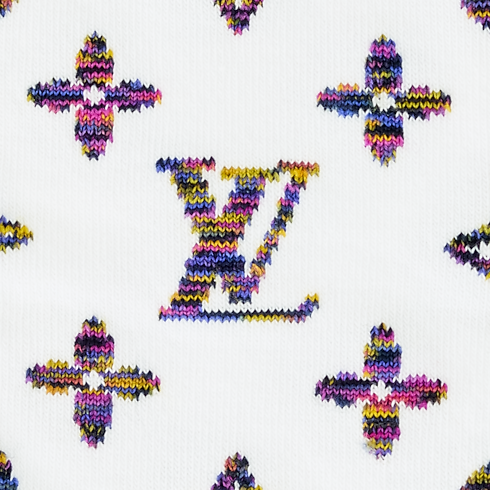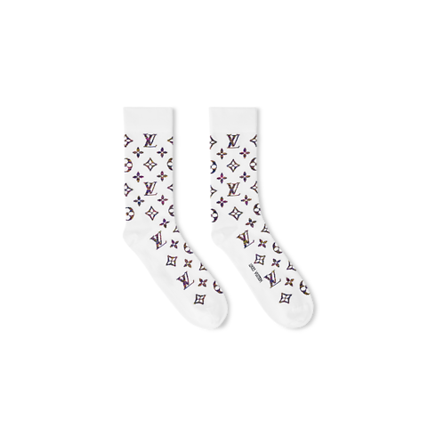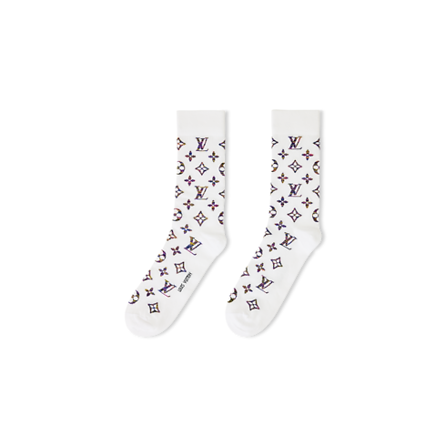 Mit einer dynamischen Interpretation des Monogram-Motivs präsentieren sich diese Socken aus einem leichten Baumwollgemisch in einer auffällig leuchtenden Farbpalette. Das ikonische Monogram des Hauses Louis Vuitton zeigt sich durchgängig vom Wade bis zu den Zehen in einer Kombination dynamischer Farbtöne wie Gelb und Violett. An der Unterseite ist eine Louis Vuitton Signatur eingearbeitet.