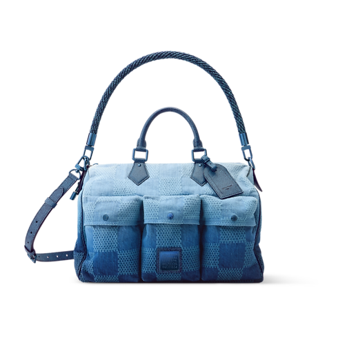 Die Speedy Outdoor 40 mit Schulterriemen ist in Damier Pigment Denim gefertigt, dessen charakteristischer Farbverlauf durch ein kunstvolles Verfahren aus Bleichen und erneuter Färbung des Jacquardgewebes entsteht. Drei Fächer auf der Vorderseite mit Druckknöpfen strukturieren das Design. Zwei Tragegriffe an der Oberseite, ein zusätzlicher längerer Griff sowie ein abnehmbarer, verstellbarer Schulterriemen erlauben vielseitige Tragemöglichkeiten.