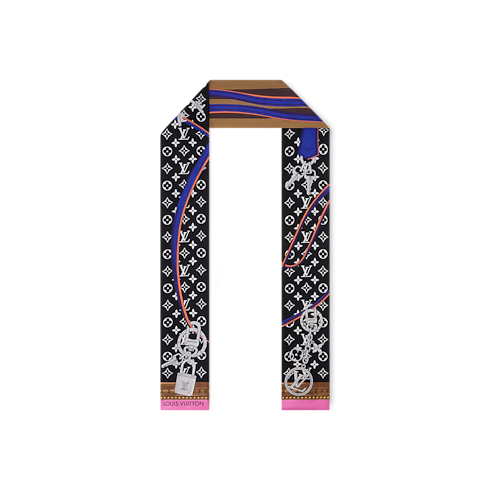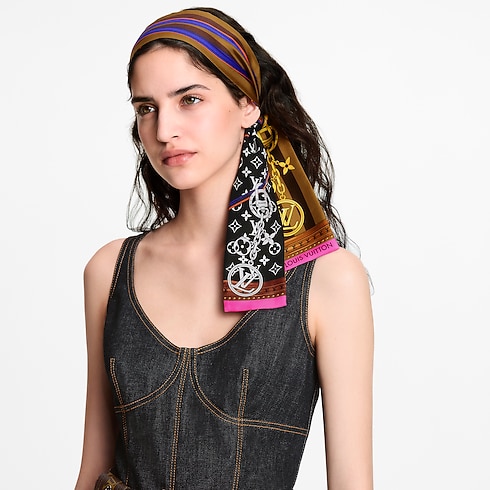 Das auffallende Design des Strap And Trunk Bandeau wurde vom Aussehen der historischen Monogram-Gepäckstücke aus dem 19. Jahrhundert inspiriert. Auf reiner Seide gedruckt, verfügt es über einen Riemen aus Leder im Koffer-Stil sowie eine Kette, die mit ikonischen Louis Vuitton Anhängern verziert ist. Ein elegantes, unverkennbares Accessoire und eine Hommage an das Erbe des Hauses Louis Vuitton in der Kunst des Reisens.