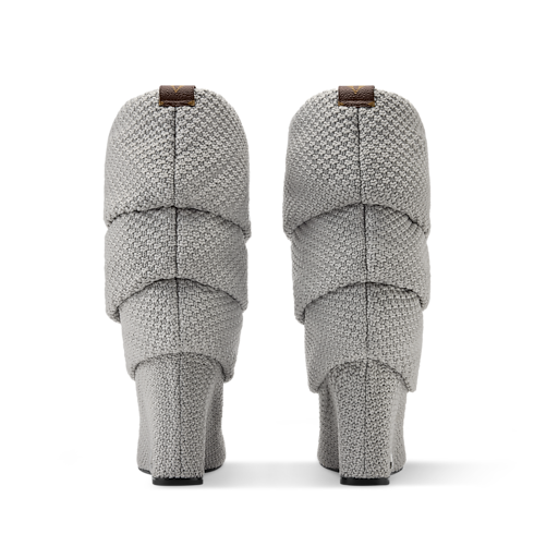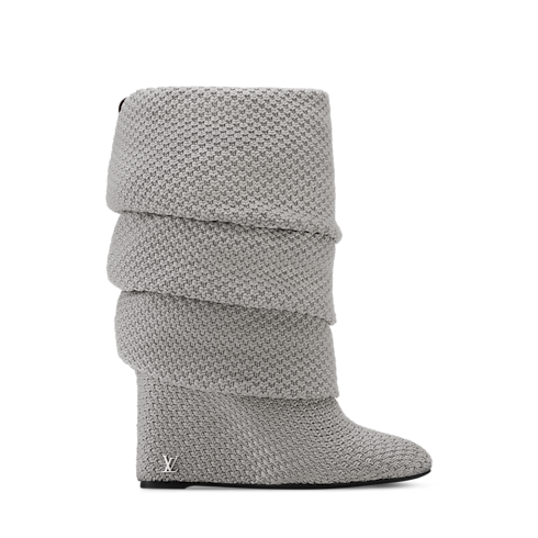 Der Summer Mid Wedge Stiefel wurde auf der Damen Herbst Winter 2025 Fashion Show des Hauses Louis Vuitton vorgestellt. Dieses von der Disco-Ära inspirierte Modell präsentiert sich aus einem speziell entwickelten Bouclé-Strick. Seine leger-elegante Silhouette akzentuiert ein hoher Keilabsatz, dem eine Niete mit den LV Initialen eine Signatur verleiht.
