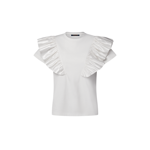 Dieses T-Shirt vom Laufsteg setzt durch zwei glänzende Volants aus glänzendem Satin an den Schultern ein plastisches Statement und verleiht dem Look romantisches Volumen. Das Modell aus atmungsaktivem Baumwolljersey in einer zeitlosen, geraden Form bietet vielseitige Stylingmöglichkeiten. Ein Ton in Ton gehaltenes Louis Vuitton Paris Patch aus Leder auf der Rückseite sorgt für eine dezente, charakteristische Note.